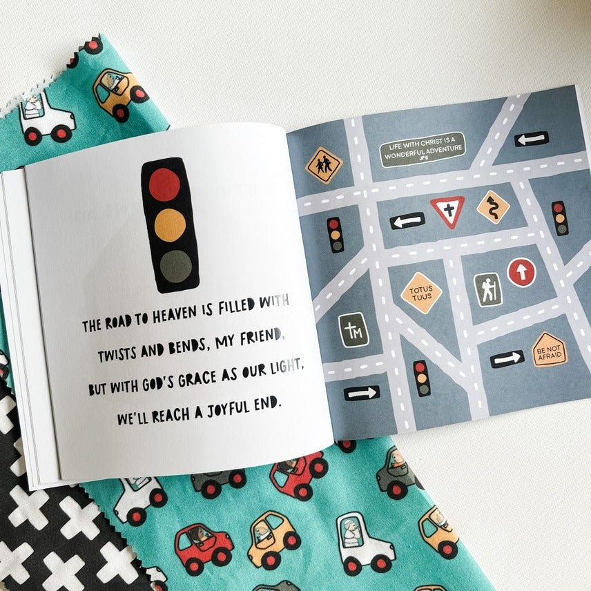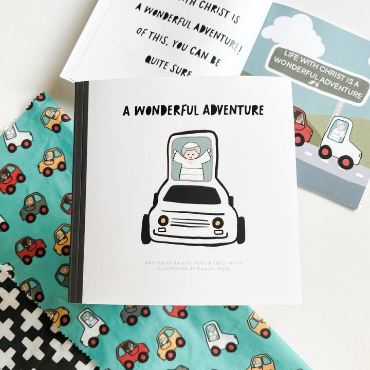 A Wonderful Adventure is a sweet Catholic children's book featuring Saint John Paul the Great and his popemobile. JPII invites children on a little ride with him in his popemobile and offers words of encouragement on their faith journey to Heaven. The book is filled with bright illustrations, and fun rhymes that little children will love and remember.